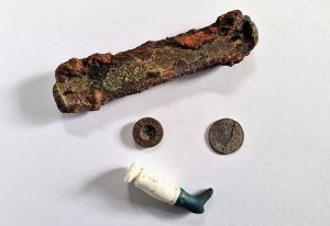 Pocket knife, 1857 threepenny coin, button and porcelain doll’s leg found near the site of the Pukerua railway camp. The doll’s leg shows there were women and children at the camp.